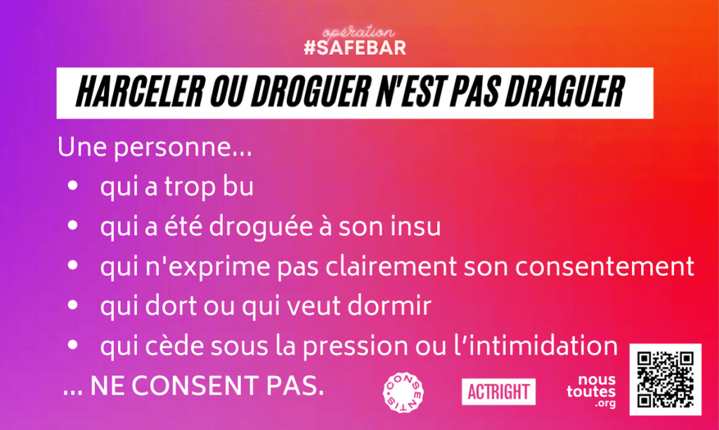 🙋♀️C’est le cas de Nous Toutes qui offre des formations pour mieux se protéger et comprendre les différences entre consentement, drague, harcèlement, agression ou viol. Cette association a lancé une grande campagne de prévention contre les violences sexistes et sexuelles en milieu festif dans toute la France, notamment contre la soumission chimique : https://www.noustoutes.org/action/safebar/. 👍
