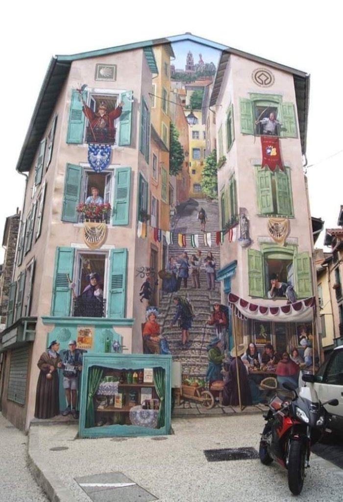 Les photos ci-dessous montrent deux fresques murales en trompe l’œil qui habillent la façade d’un immeuble. Cela ne change rien à l’immeuble, mais change tout à l’atmosphère extérieure.