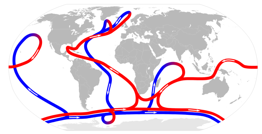 🌎🌍🌏 Le mouvement à grande échelle des masses océaniques est appelé circulation thermohaline ou MOC. Ce courant dans l’Atlantique Nord, l’AMOC (Atlantic Meridional Overturning Circulation), est très efficace pour absorber, stocker et redistribuer la chaleur, le sel, le carbone et l’oxygène tout autour du globe, si bien qu’il est nommé parfois le thermostat du climat mondial.1 Le schéma ci-dessous2 permet de visualiser la circulation thermohaline avec en rouge les courants de surface et en bleu les courants en profondeur.